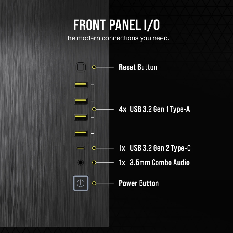 Case Front IO: (1x) USB 3.2 Gen 2 Type-C, (4x) USB 3.2 Gen 1 Type-A, (1x) Audio in/out