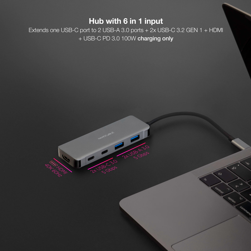 Con nuestro HUB podrás cargar tus dispositivos, convertir vídeo a HDMI y transferir datos a alta velocidad en cualquier parte, sin tener que preocuparte por instalar ningún software para utilizarlo.