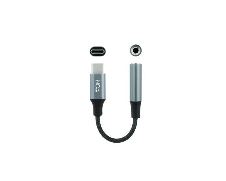 Cable adaptador de audio de USB-C macho en un extremo y JACK 3.5 hembra en el otro