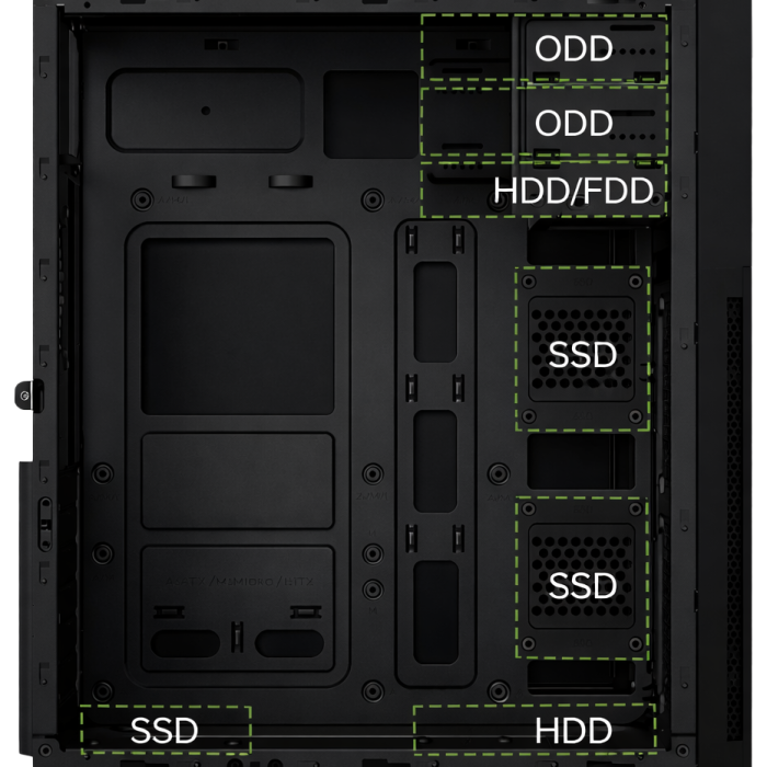 ATX / Cooler CPU 140/mm / 3×SSD + 1×HDD / USBC + USB 3.0 + USB 2.0 / fuente 500w