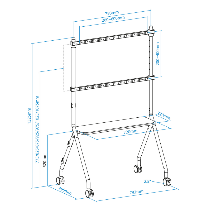 Pantallas de 49 a 80"/ VESA Max 600x400/ Hasta 50kg/ Bandeja inferior multiusos/ Ajustable en altura
