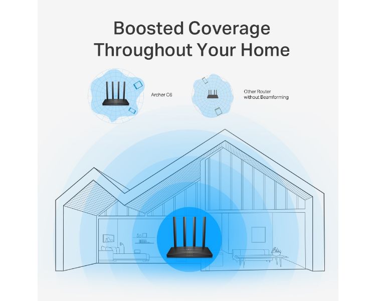 Cuatro antenas externas envían señales Wi-Fi a todos los rincones de tu hogar. Manténte conectado y disfruta de una Wi-Fi rápida tanto si estás descansando en el sofá como en el balcón. La tecnología Beamforming detecta los dispositivos, incluso si están lejos o tienen poca potencia, y concentra la fuerza de la señal inalámbrica hacia ellos.
